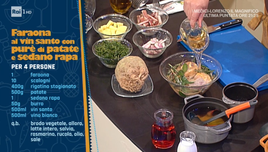 - 1 faraona, 10 scalogni, 400 g rigatino stagionato, 500 g patate, 1 sedano rapa, 50 g burro, 500 ml vin santo, 500 ml vino bianco, brodo vegetale, alloro, latte intero, salvia, rosmarino, rucola, olio, sale