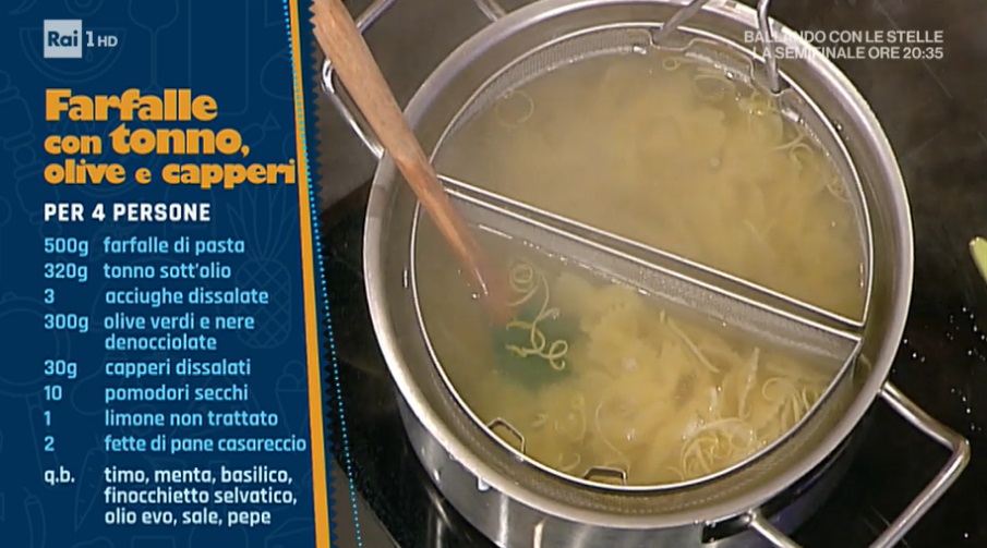 farfalle con tonno olive e capperi di Luisanna MesseriUn duello iniziale dal sapore squisitamente estivo, quello tra Luisanna Messeri e Ivan Bacchi, giocato sul campo della pasta fredda. Ecco la ricetta della cuoca toscana, ovvero quella delle farfalle con tonno olive e capperi.
