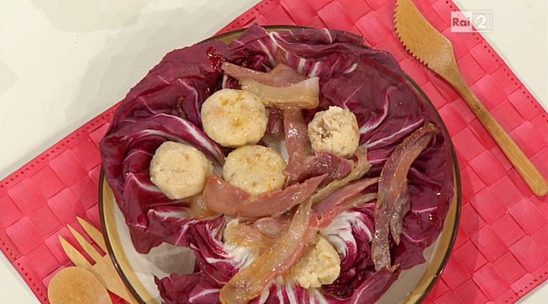 Ammolliamo il pane raffermo nel latte; lo strizziamo, quindi lo impastiamo con la farina ed il parmigiano (o grana). Formiamo gli gnocchi, ovvero delle piccole sfere. In una padella, sciogliamo il burro, quindi vi rosoliamo il prosciutto crudo. Tuffiamo gli gnocchi nell’acqua bollente e salata; quando vengono a galla, li scoliamo e li disponiamo su un letto di radicchio; condiamo con il burro ed il prosciutto crudo rosolato.