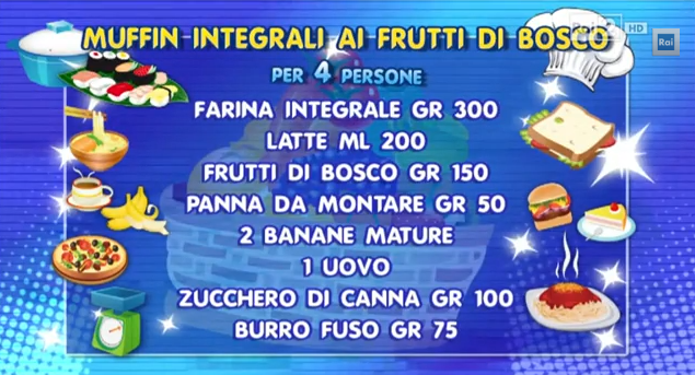 La ricetta dei muffin integrali ai frutti di bosco, proposta da Marisa Laurito a “I Fatti Vostri”.
