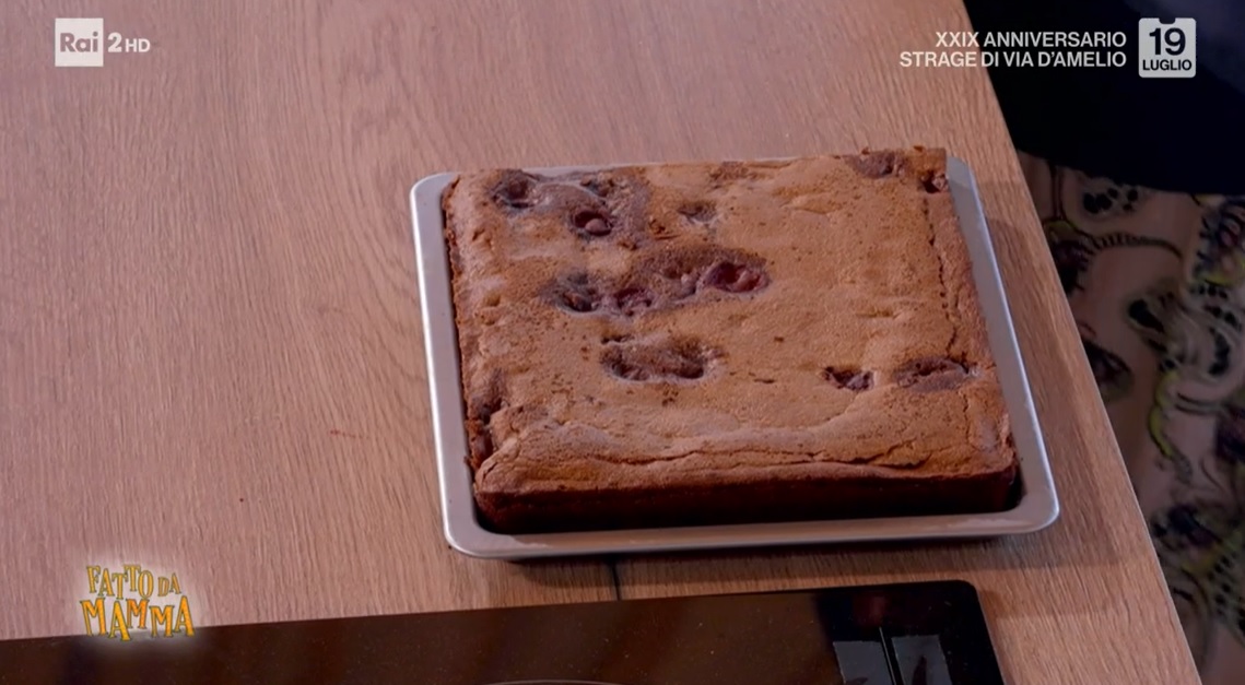 A questo punto, aggiungiamo un pizzico di sale e, infine, la farina 00. Ottenuto un impasto omogeneo, incorporiamo le ciliegie denocciolate e mescoliamo. Versiamo l’impasto all’interno di una teglia rettangolare dai bordi bassi, imburrata e foderata con della carta forno. Livelliamo e cuociamo in forno caldo e statico a 180° per 20 minuti.
