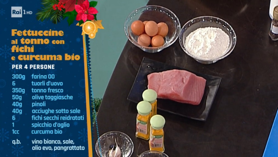 Il Natale si avvicina ed il tonno diverrà protagonista delle nostre tavole, soprattutto in vista della Vigilia. A preparare un piatto a base di tonno fresco è Diego Bongiovanni, che propone le fettuccine al tonno con fichi e curcuma.