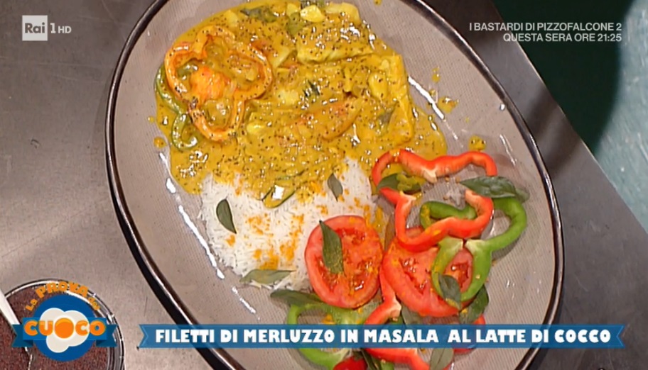 Aggiungiamo i peperoni puliti e a fettine ed il pomodoro fresco in coste. Saliamo e spolveriamo con la curcuma in polvere. Bagniamo con il latte di cocco e lasciamo cuocere qualche istante. Possiamo anche aggiungere del peperoncino fresco e/o dello zenzero. Inseriamo a questo punto i filetti di merluzzo. Dopo qualche istante, li giriamo e completiamo la cottura. Serviamo con una cupola di riso bianco.