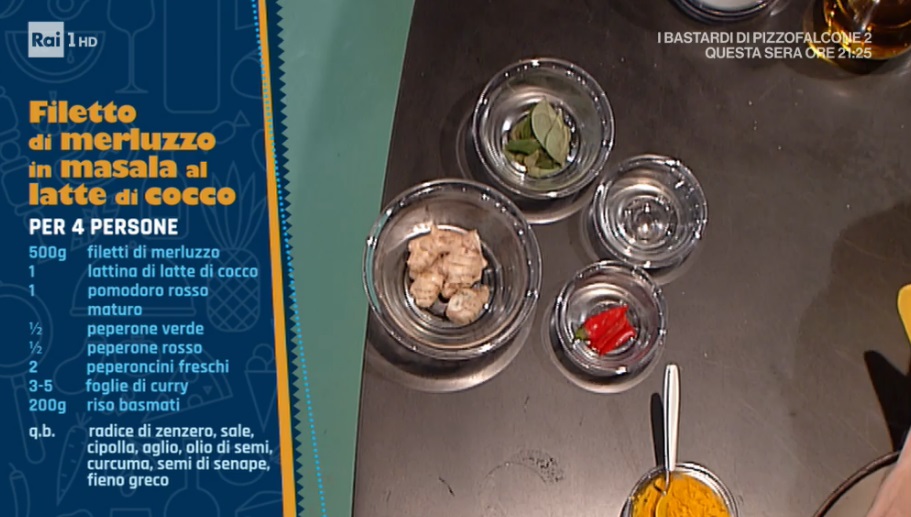 - 500 g filetti di merluzzo, 1 lattina di latte di cocco, 1 pomodoro rosso maturo, mezzo peperone verde, mezzo peperone rosso, 2 peperoncini freschi, 3-5 foglie di curry, 200 g riso basmati, radice di zenzero, sale, cipolla, aglio, olio di semi, curcuma, semi di senape, fieno greco
