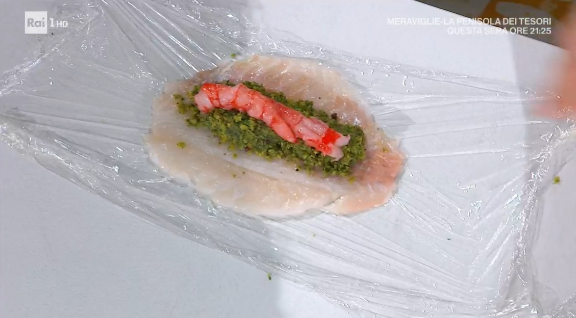 Prendiamo i filetti di orata e li battiamo tra due fogli di pellicola, in modo da assottigliarli. Saliamo e al centro mettiamo un po’ del ripieno preparato ed un gambero pulito (o una stecca di carota lessa). Aiutandoci con la pellicola, ripieghiamo l’orata sul ripieno e chiudiamo la pellicola a caramella. Cuociamo gli involtini in vaporiera per 10-15 minuti (oppure, li immergiamo in acqua bollente per il tempo necessario). Una volta cotti, togliamo la pellicola e li condiamo con scorza grattugiata degli agrumi ed il finocchietto selvatico tritato.
