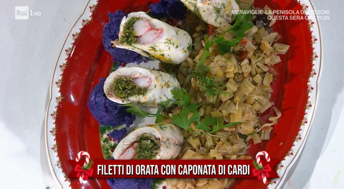 Sul piatto da portata, creiamo un letto di caponata. Accompagniamo dei mucchietti di patate viola ed affianchiamo gli involtini di orata.