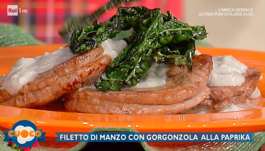 - 4 medaglioni di filetto di manzo, 200 g di gorgonzola piccante, 1 noce di burro, ½ bicchiere di vino marsala secco, 5 cc di latte intero, noce moscata, paprika dolce, cavolo nero e olio di semi di girasole
