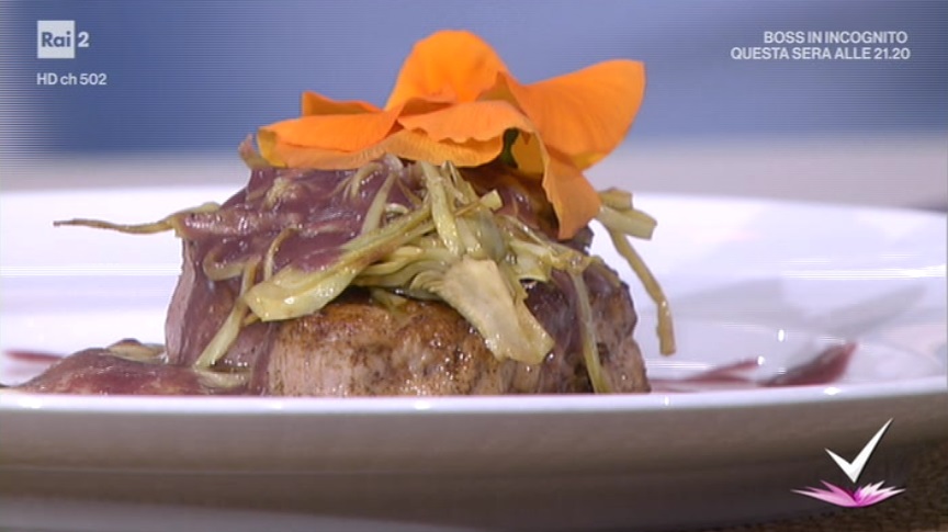 Su un piatto, posizioniamo una fetta di formaggio e lo sciogliamo leggermente con il cannello. Posizioniamo sopra il filetto caldo, i carciofi e irroriamo con la salsa.