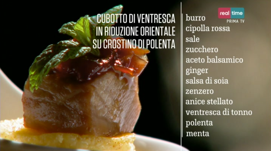 La ricetta del cubotto di ventresca in riduzione orientale su crostino di polenta, proposta dallo chef Sebastiano Rovida, nella puntata odierna di “Finger Food Factory”.