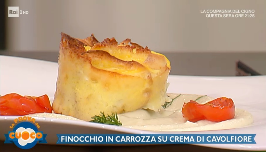 Sul piatto, formiamo un letto di crema di cavolfiore. Adagiamo sopra le foglie di aneto, il finocchio in carrozza ed i pomodorini confit (essiccati in forno per lungo tempo con sale, zucchero ed erbe aromatiche).