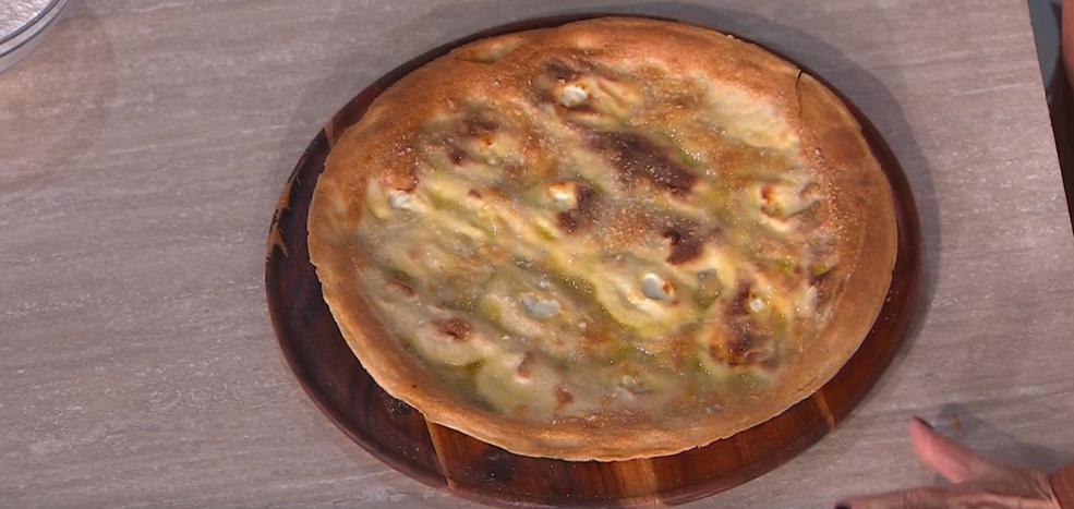 Oliamo e spolveriamo con della farina di mais (possiamo anche non metterla) una tortiera del diametro di 30 cm. Con il mattarello, stendiamo sottilmente un panetto da 180 g: dev’essere quasi trasparente. Lo posizioniamo sul fondo e sui bordi della tortiera, quindi distribuiamo sopra dei fiocchi di crescenza o stracchino. Stendiamo un panetto più piccolo sottilissimo e lo usiamo per coprire la crescenza, sigillando bene i bordi e ritagliando l’eccesso. Oliamo la superficie, buchiamo in prossimità della crescenza e cuociamo in forno caldo e statico a 250° per 15 minuti o fino a doratura, meglio se con la pietra refrattaria.