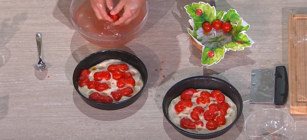 Ungiamo con abbondante olio la teglia (con queste dosi, possiamo farne due da 20 cm di diametro), adagiamo l’impasto, copriamo e lasciamo lievitare per circa 20 minuti. Con le mani unte, schiacciamo leggermente l’impasto, in modo da stenderlo e creare le tipiche fossette.