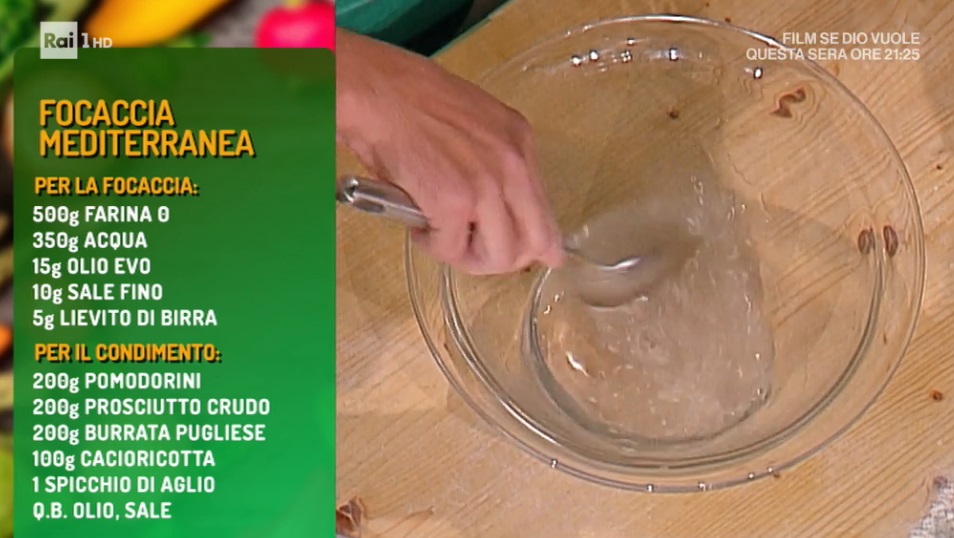- Focaccia: 500 g farina 0, 350 g acqua, 15 g olio evo, 10 g sale fino, 5 g lievito di birra