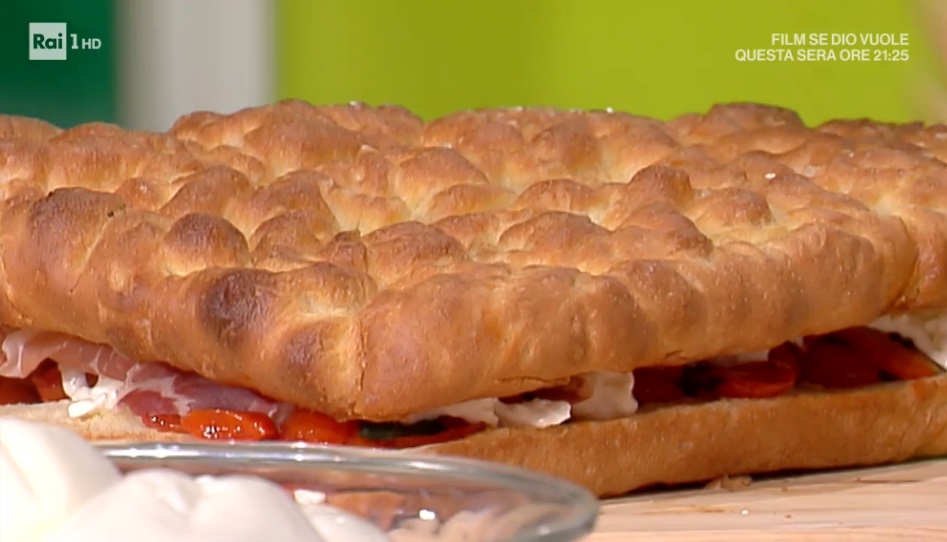 Tagliamo la focaccia a metà, come fosse un panino. La farciamo con i pomodorini saltati in padella, il prosciutto crudo, il cacio ricotta e la burrata pugliese. Serviamo a fette.