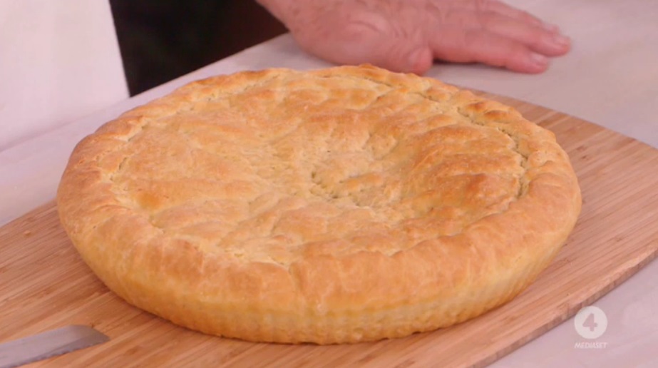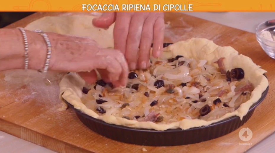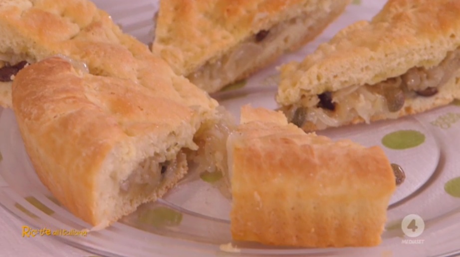 Ungiamo una teglia da crostate con un filo d’olio. Stendiamo un panetto lievitato sul piano infarinato, quindi inseriamo il disco ottenuto alla base della teglia, coprendo il fondo ed i bordi. Farciamo la focaccia con il ripieno di cipolle. Copriamo con l’altro disco di pasta lievitata, sigillando bene i bordi e bucherellando la superficie con una forchetta. Cuociamo in forno caldo e statico a 200° per 30 minuti (controllate che la base sia dorata).