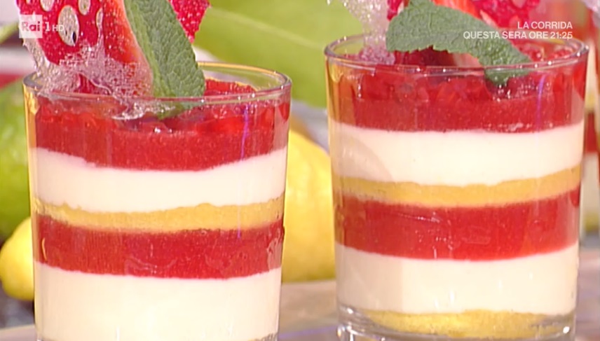 All’interno dei bicchieri scelti, inseriamo dei dischetti di biscotto savoiardo (possiamo usare quelli già pronti). Inzuppiamo con infuso di vaniglia e menta. Formiamo uno strato di crema al mascarpone e mettiamo a raffreddare in freezer. Formiamo sopra uno strato di gelatina di fragole. Mettiamo ancora in freezer, in modo da farlo indurire. Formiamo un altro strato di savoiardo inzuppato e crema al mascarpone. Facciamo indurire in freezer e finiamo con uno strato di gelatina alle fragole. Mettiamo in frigorifero. Copriamo l’ultimo strato di gelatina di fragole con la brunoise di fragole.