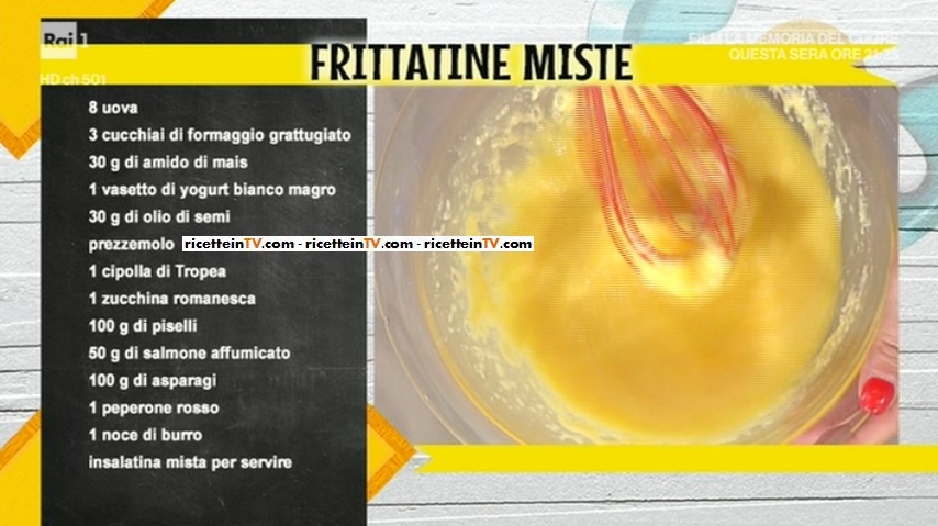 - 8 uova, 3 cucchiai di formaggio grattugiato, 30 g amido di mais, 1 vasetto di yogurt bianco, 30 g olio di semi, prezzemolo, 1 cipolla di Tropea, 1 zucchina, 100 g piselli, 50 g salmone affumicato, 100 g asparagi, 1 peperone rosso, 1 noce di burro, insalatina mista