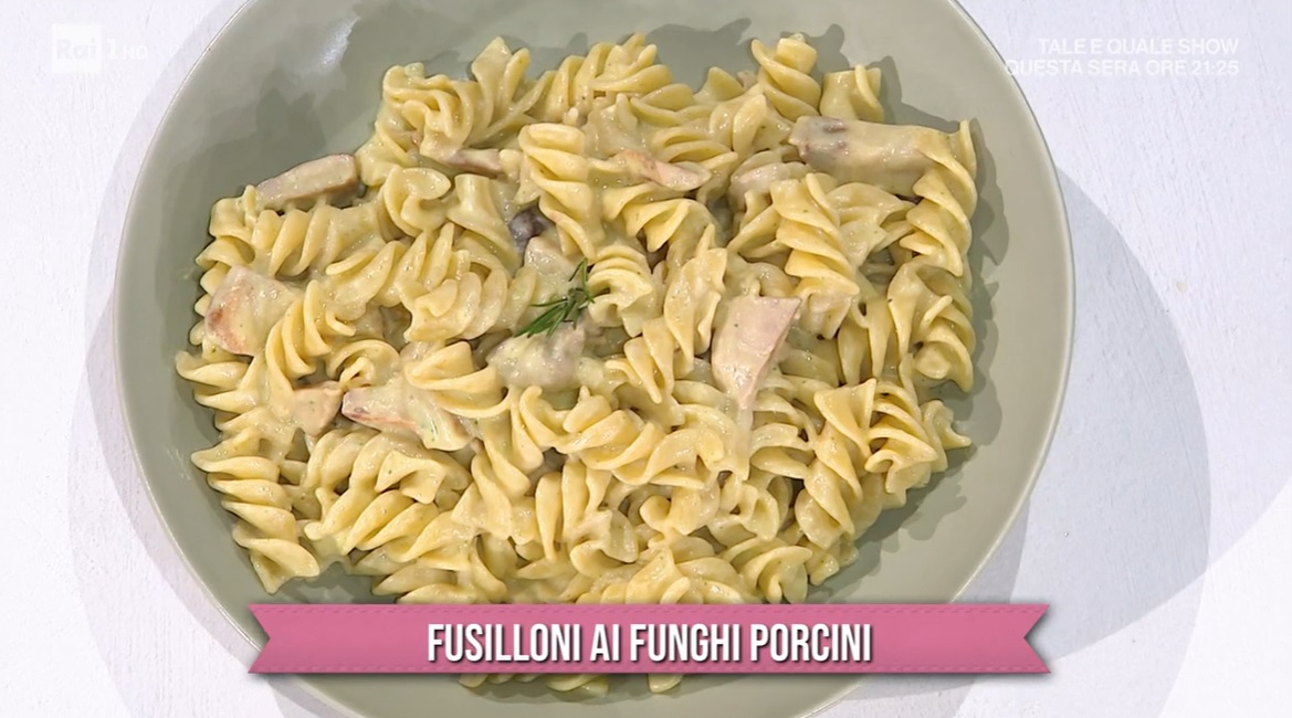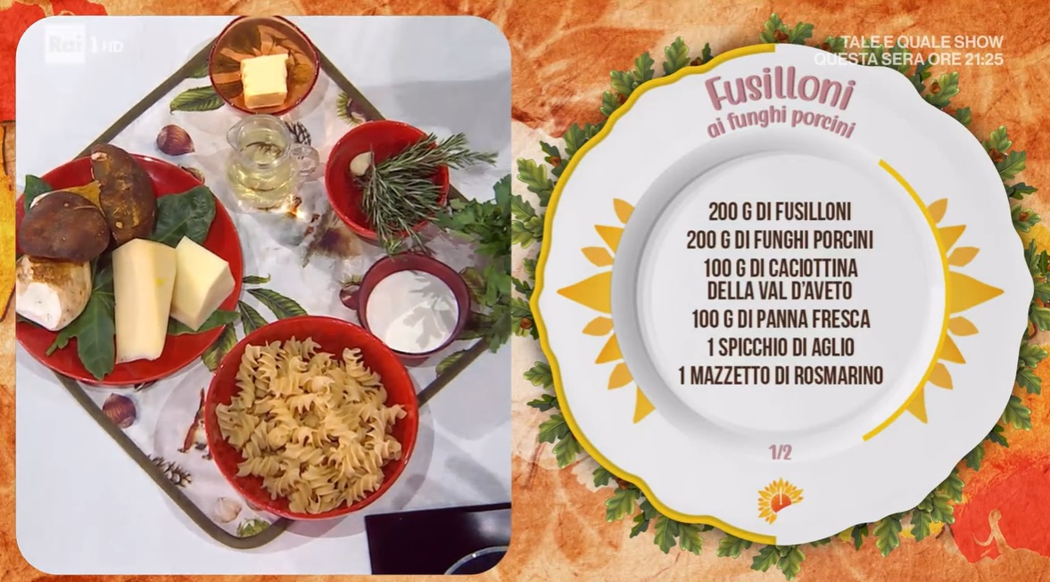 - 200 g fusilloni, 200 g funghi porcini, 100 g caciottina di Val D’Aveto, 100 g panna, 1 spicchio d’aglio, 1 mazzetto di rosmarino, mezzo bicchiere di vino bianco, prezzemolo, 50 g burro, olio evo