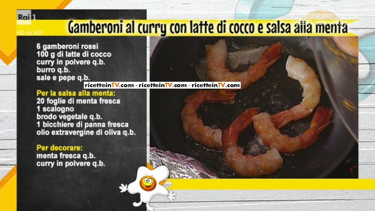 Puliamo i gamberi. Li saliamo e li pepiamo. Li spolveriamo anche con del curry piccante in polvere. In padella, sciogliamo una noce di burro. Mettiamo a cuocere i gamberoni, 1 minuto per lato, a fuoco alto. Spolveriamo con altro curry e ‘anneghiamo’ nel latte di cocco. Lasciamo cuocere dolcemente per qualche minuto. Impiattiamo i gamberoni (6 per porzione) e li bagniamo con la riduzione alla menta.