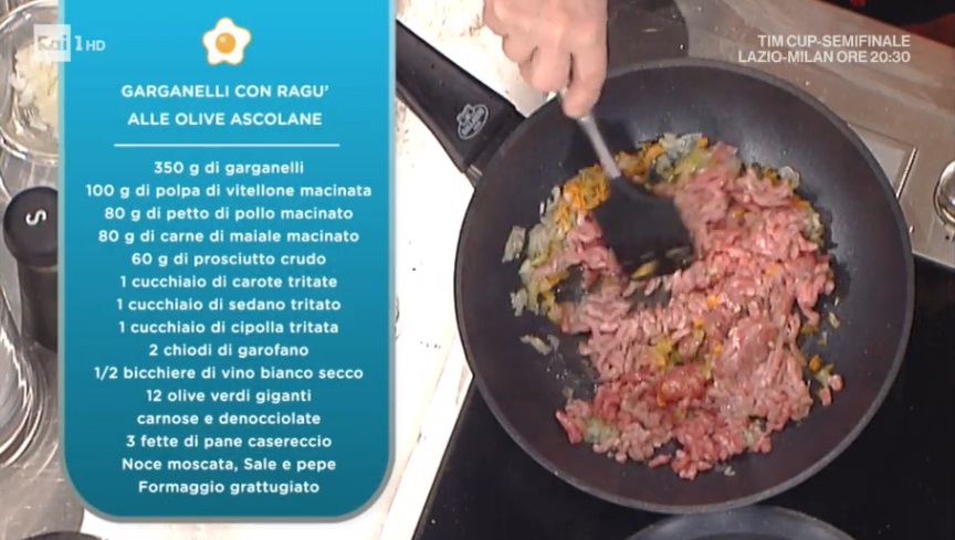 Ad aprire il menu di oggi è l’inossidabile Anna Moroni, che prepara uno dei suoi primi piatti piatti golosissimi e veloci. Prepariamo i garganelli con ragù alle olive ascolane. Con gli avanzi, possiamo preparare le finte olive ascolane…