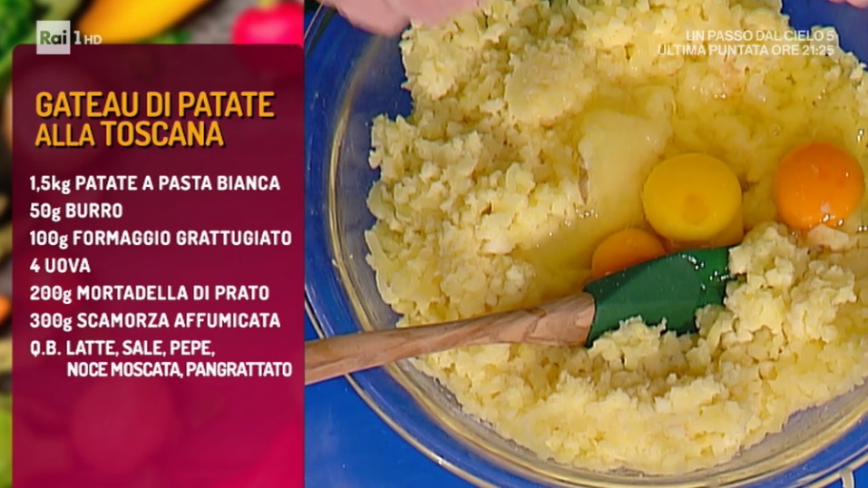 Cuociamo le patate (con la buccia) in forno e, una volta cotte, le peliamo e le schiacciamo all’interno di una ciotola capiente. Uniamo le uova intere, il formaggio grattugiato, un po’ di latte, sale, pepe e noce moscata in polvere. Lavoriamo fino ad ottenere un composto omogeneo e teniamo da parte.