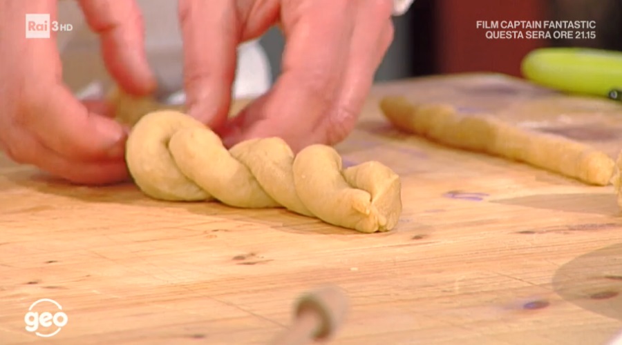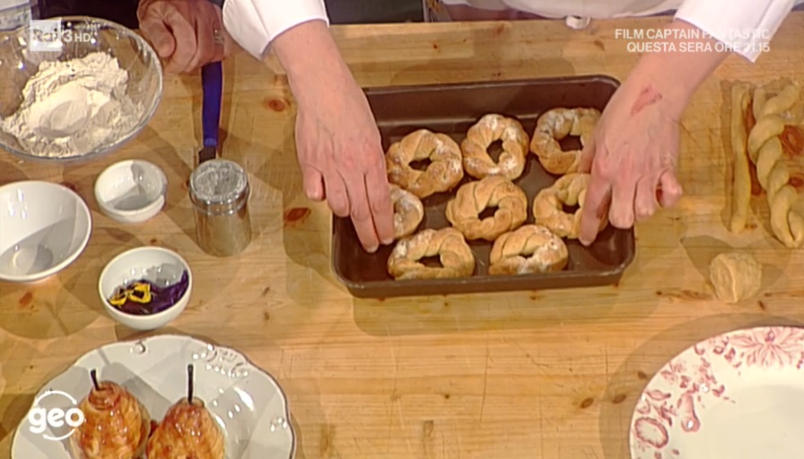 Formiamo dei salsicciotti piuttosto sottili, lunghi circa 10-15 cm. Ne affianchiamo 2 e li intrecciamo tra loro (foto), quindi li chiudiamo a ciambella. Disponiamo su una teglia con carta forno, spennelliamo con dell’olio e spolveriamo con zucchero a velo. Cuociamo, per 20 minuti, in forno preriscaldato e statico a 180°. Devono essere dorate.