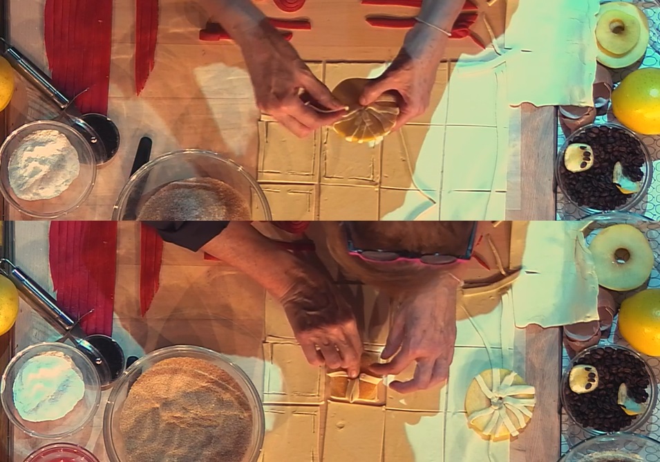 Per i fiori, invece, ricaviamo dei quadratoni dalla sfoglia. Incidiamo gli angoli di ogni quadrato (foto), quindi posizioniamo l’anello di mela al centro del quadrato e ripieghiamo gli angoli verso il centro, pressando. Passiamo le mele nel latte di mandorle (o vaccino) e subito dopo in un mix di zucchero di canna, sale e cannella. Le disponiamo su una teglia di carta forno e le cuociamo a 180 gradi in forno ventilato per 20 minuti.