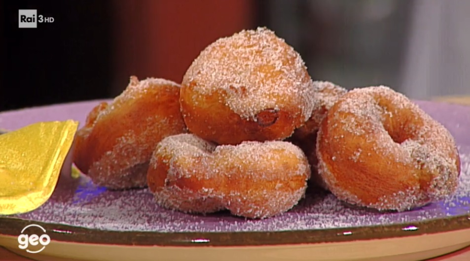 Disponiamo la farina a fontana e mettiamo al centro le patate schiacciate. Aggiungiamo quindi le uova, lo zucchero, il lievito chimico ed il lievito di birra sbriciolato. Iniziamo ad impastare, quindi aggiungiamo la scorza ed il succo delle arance, a piacere un bicchierino di liquore e, infine, il burro morbido a tocchetti. Lavoriamo fino ad ottenere un composto liscio ed omogeneo, simile a quello degli gnocchi. Diego aggiunge anche un pugno di uvetta.