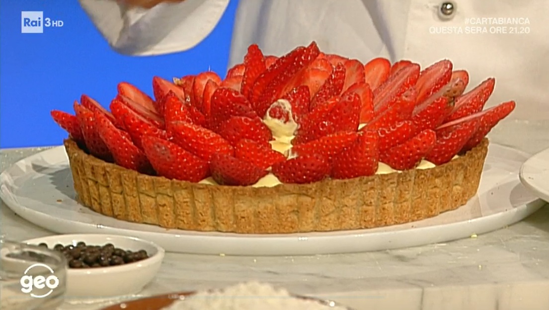 - Crema chantilly: 400 g latte, 100 g tuorli, 150 g zucchero semolato, 20 g amido di mais, 18 g amido di riso, vaniglia, 200 g panna fresca, fragole