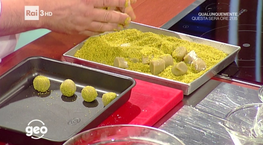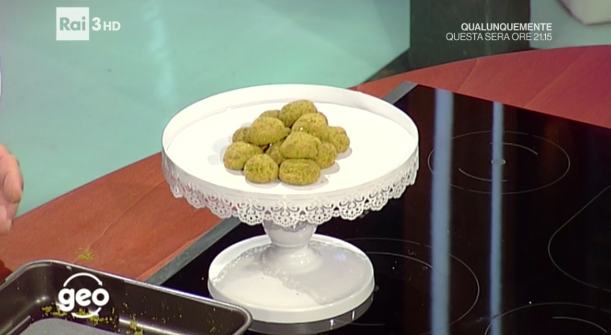 Formiamo delle palline con l’impasto e le passiamo nello zucchero a velo o nella farina di pistacchi. Se quest’ultima non si attacca, inumidiamo le dita con dell’albume prima di passare le palline nella farina. Cuociamo in forno preriscaldato a 180 °C per circa 10 minuti, a valvola aperta (ovvero, portellone del forno socchiuso).