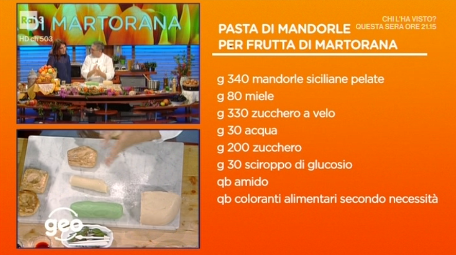 frutta martorana (dolce siciliano) di Santi PalazzoloSanti Palazzolo, stimato pasticciere siciliano, ha proposto una delle sue ricette all’interno di Geo, lo storico programma di Rai3 condotto, ogni pomeriggio, da Sveva Sagramola. Nel dettaglio, l’abile pasticciere ci ha spiegato come preparare una specialità tipica di questo periodo, la frutta martorana.