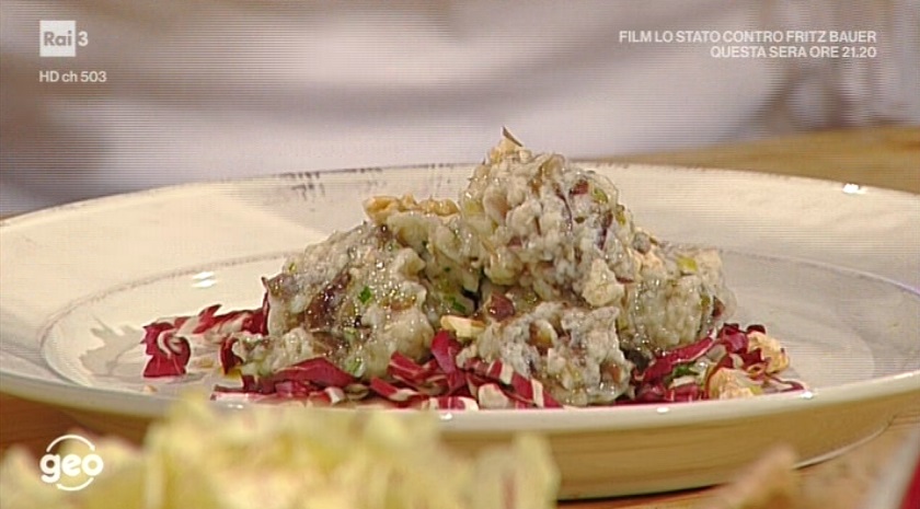 - 200 g mollica di pane raffermo, qb latte, 3-4 uova, qb farina 00, qb pecorino, 1 sfera di radicchio, qb olio evo, qb rosmarino, qb noci, qb sale, pepe in grani