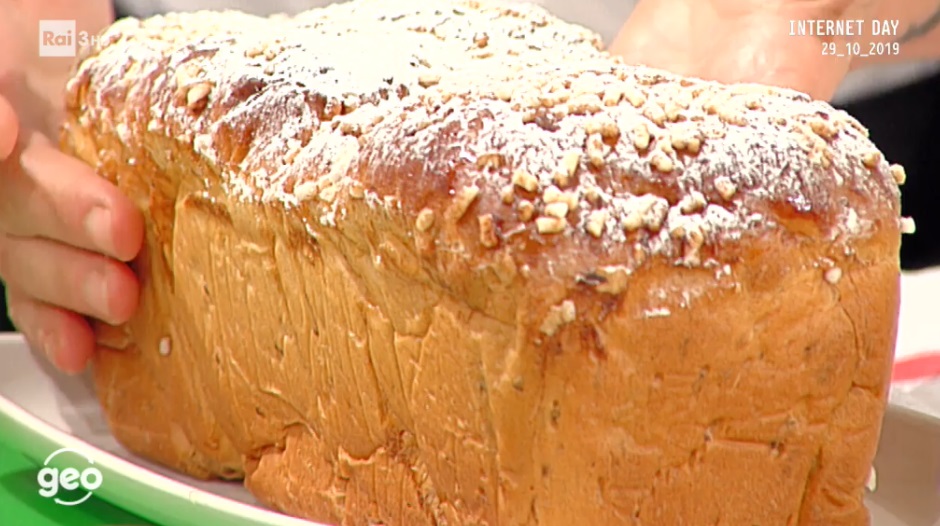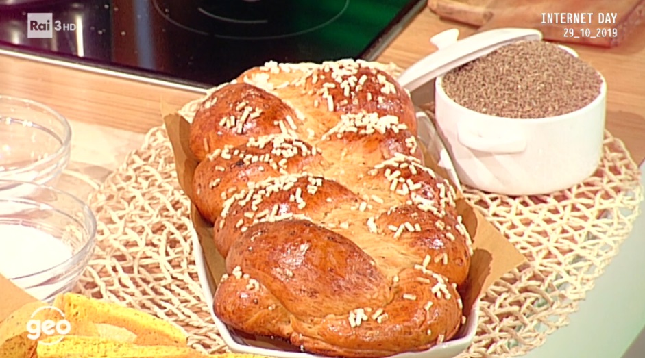 Dividiamo l’impasto in tre parti uguali e formiamo tre salsicciotti di 30 cm circa di lunghezza. Li intrecciamo tra loro. Inseriamo la treccia dentro uno stampo da plumcake o la appoggiamo su una teglia con carta forno e lasciamo lievitare, coperta, ancora un’ora. Spennelliamo con una miscela di tuorlo e miele, quindi spolveriamo con granella di zucchero. Cuociamo in forno preriscaldato e statico a 180° per 35-40 minuti. Appena cotta, la sformiamo e la lasciamo raffreddare su una gratella.
