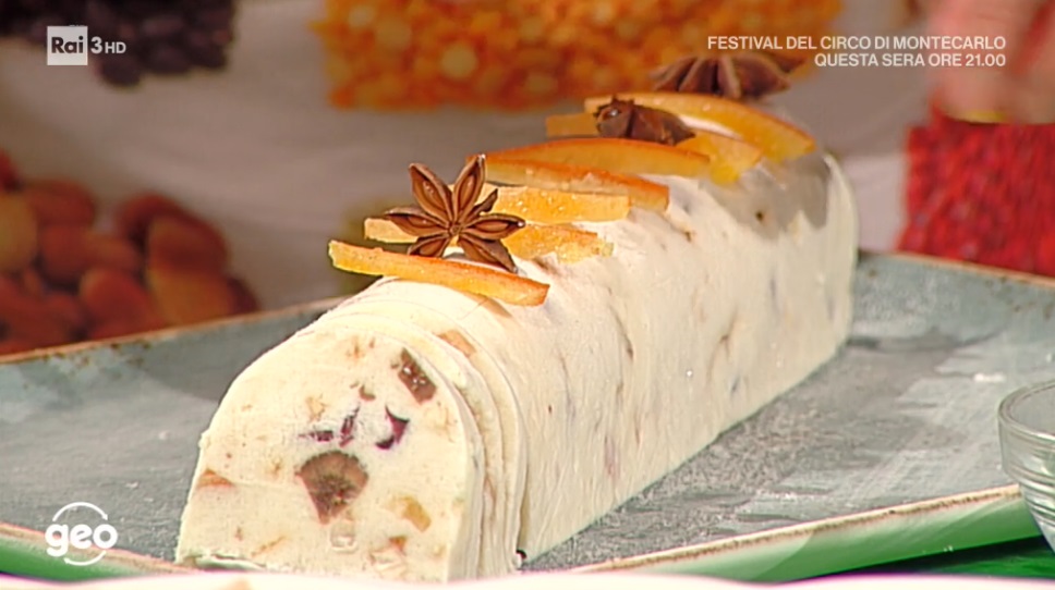 - 350 g ricotta, 4-5 fichi secchi, 30 g scorze arancia candite, 100 g croccante alle mandorle, 1 cucchiaio di miele, 1 cucchiaino di liquore all’arancia, 300 g panna da montare, 90 g albumi, 125 g zucchero a velo, 100 g cioccolato fondente 70%