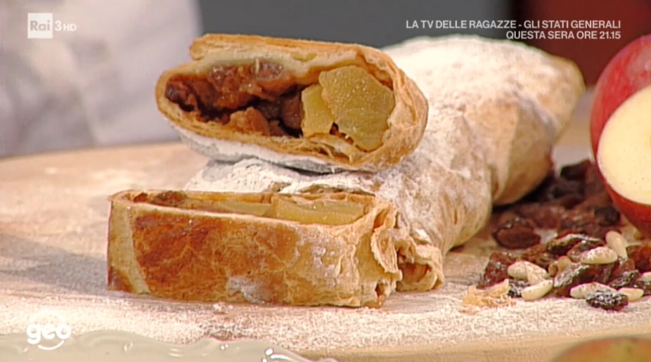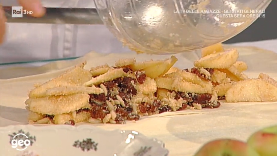 - Ripieno: 600 g di mele, 50 g di zucchero, 50 g pane grattugiato abbrustolito nel burro, 40 g uvetta, 20 g pinoli, qb rum, qb vaniglia, cannella, buccia limone