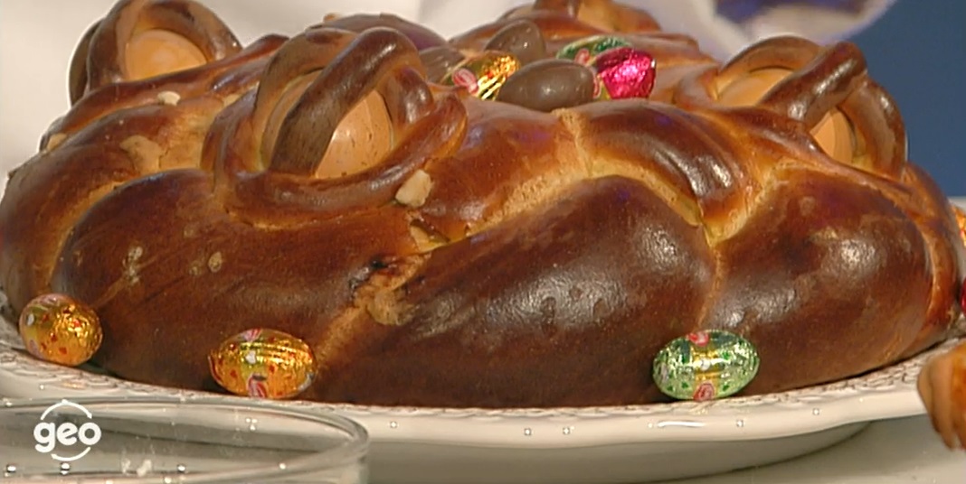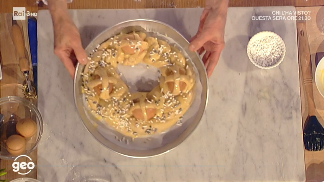 Dividiamo l’impasto in 3 parti uguali e formiamo tre filoncini della lunghezza di 60 cm circa. Li intrecciamo tra loro e li chiudiamo a ciambella. Lasciamo lievitare su una teglia con carta da forno fino a che raddoppia il volume. A piacere, decoriamo con le uova crude, inserendole nelle anse e fissandole con dei bastoncini sottili di impasto. Spennelliamo con il tuorlo stemperato con il latte e la granella di zucchero. Cuociamo in forno preriscaldato a 170°C per 35 minuti.