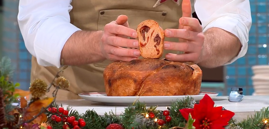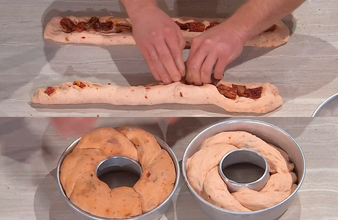 Dividiamo l’impasto a metà e, ciascuna metà, ancora a metà (otterremo 4 panetti, quindi 2 ciambelle). Con due panetti, formiamo due filoni della stessa lunghezza, che schiacciamo al centro, in modo da creare un incavo centrale. Farciamo quest’ultimo con i pomodori secchi a pezzetti o delle olive e spolveriamo con l’origano. Richiudiamo l’impasto sul ripieno e arrotondiamo ciascun filone. Intrecciamo i due filoni e li inseriamo in una teglia da ciambella. Copriamo e lasciamo lievitare fino al raddoppio. Cuociamo in forno caldo e statico a 230° per 40 minuti.