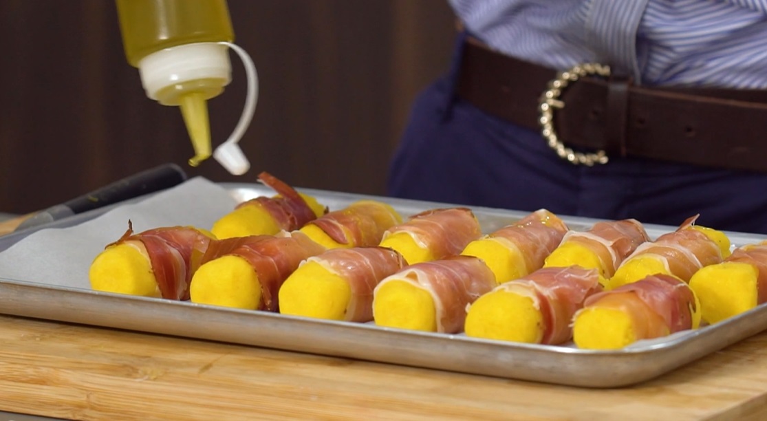 Preleviamo dei pugnetti di impasto di patate, diamo la forma di crocchette ed inseriamo al centro la strisciolina di scamorza, coprendola bene con le patate. Arrotoliamo la crocchetta nello speck affettato. Disponiamo le crocchette su una teglia con carta forno. Un filo d’olio, una spolverata di pepe e cuociamo in forno caldo e statico a 200° per 10 minuti.