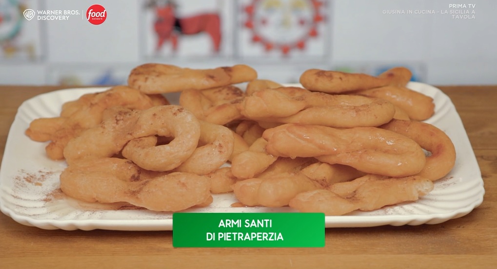 Nelle nuove puntate della serie di Food Network Giusina in cucina, dedicata alla cucina siciliana preparata in maniera semplice, ‘casalinga‘, in onda sabato 25 marzo, alle 15:45, sul canale 33, Giusina Battaglia, giornalista ed appassionata di cucina, ha preparato un menu squisitamente siciliano, rivelando la ‘sua‘ ricetta di Armi Santi di Pietraperzia. Trovate le ricette di Giusina nel suo libro, da poco in libreria, e sul suo sito, giusinaincucina.com. Di seguito gli ingredienti necessari ed il procedimento.