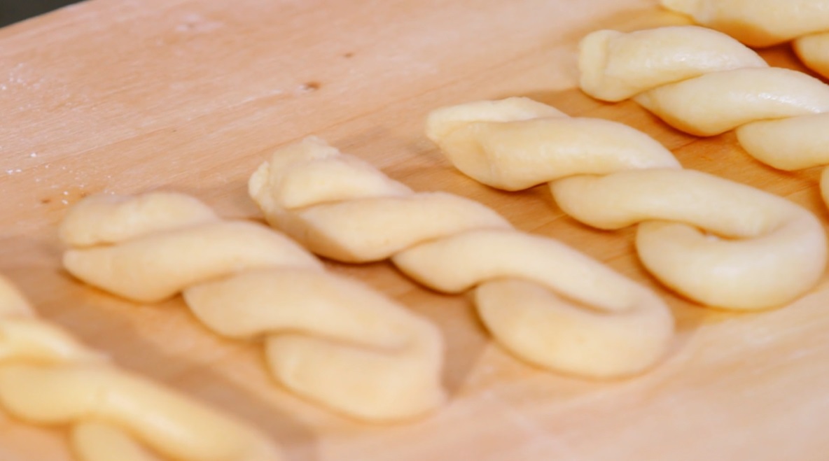 Dividiamo l’impasto in pezzi e con ognuno formiamo dei serpentelli a forma di ferro di cavallo ed intrecciamo le due estremità, in modo da formare delle treccine. Le disponiamo su una teglia con carta forno e le spennelliamo con una miscela di tuorlo d’uovo e latte. Cuociamo in forno caldo e statico a 180° per 15-20 minuti: devono essere ben dorate.