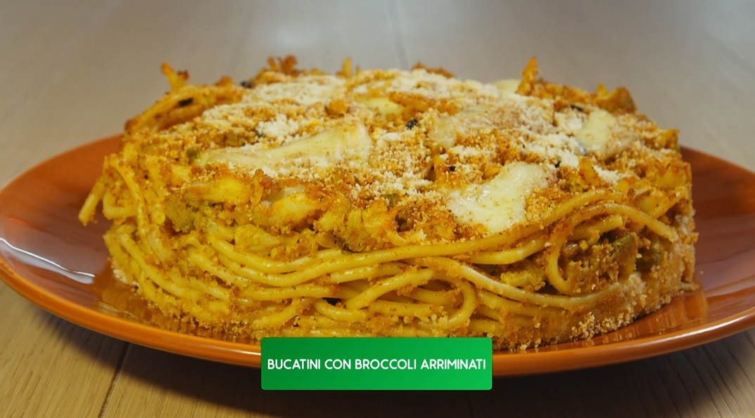 - 300 g grammi di bucatini, filetto di acciuga, pangrattato tostato (mollica atturrata), parmigiano, 50 g uvetta, 50 g pinoli, estratto di pomodoro, zafferano, 1 kg broccolo verde, ipolla, sale e pepe, olio, tuma