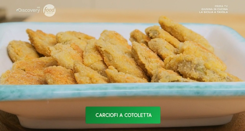 carciofi a cotolettaNelle nuove puntate della serie di Food Network Giusina in cucina, dedicata alla cucina siciliana preparata in maniera semplice, ‘casalinga‘, in onda sabato 26 marzo, alle 15:45, sul canale 33, Giusina Battaglia, giornalista ed appassionata di cucina, ha preparato un menu squisitamente siciliano, rivelando la ‘sua‘ ricetta dei carciofi a cotoletta. Trovate le ricette di Giusina nel suo libro, da poco in libreria, e sul suo sito, giusinaincucina.com. Di seguito gli ingredienti necessari ed il procedimento.