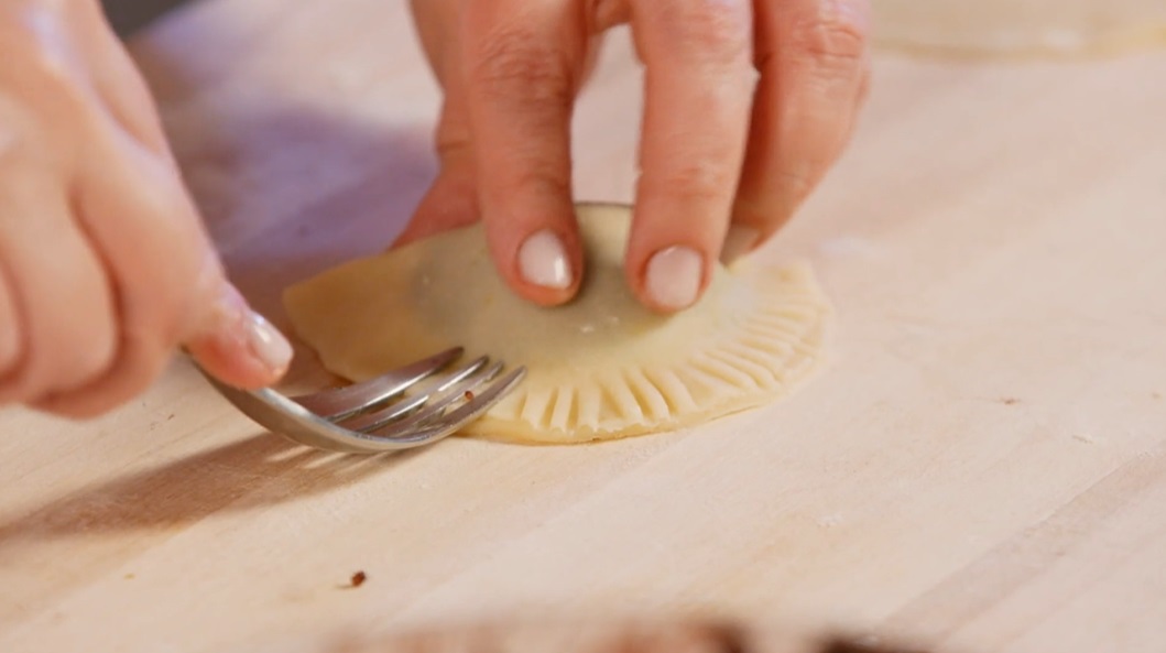Il giorno dopo, stendiamo la frolla con il mattarello, ad uno spessore di 3-5 mm. Ritagliamo dei dischi del diametro di circa 10 cm. Su ogni dischetto mettiamo un cucchiaino generoso di ripieno. Inumidiamo i bordi della frolla con un po’ di albume, quindi richiudiamo a mezzaluna e sigilliamo bene le estremità pressando con una forchetta. Cuociamo in forno caldo e statico 180° per 15 minuti: NON devono dorare. Una volta fredde, le spolveriamo con abbondante zucchero a velo.