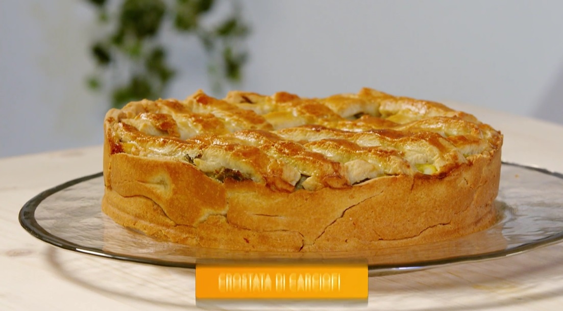 Stendiamo la frolla con il mattarello, utilizzando il mattarello, e la inseriamo all’interno di una tortiera, in modo da foderare fondo e bordi. Bucherelliamo il fondo e distribuiamo sopra i carciofi spadellati. Copriamo con il composto di besciamella e formaggi e finiamo con i carciofi rimasti ed abbondante parmigiano grattugiato. Finiamo con le strisce di frolla (proprio come una crostata dolce!). Spennelliamo con tuolo d’uovo sbattuto con poco latte e Cuociamo in forno caldo e statico a 180° per 40 minuti: la frolla dev’essere ben cotta sul fondo.