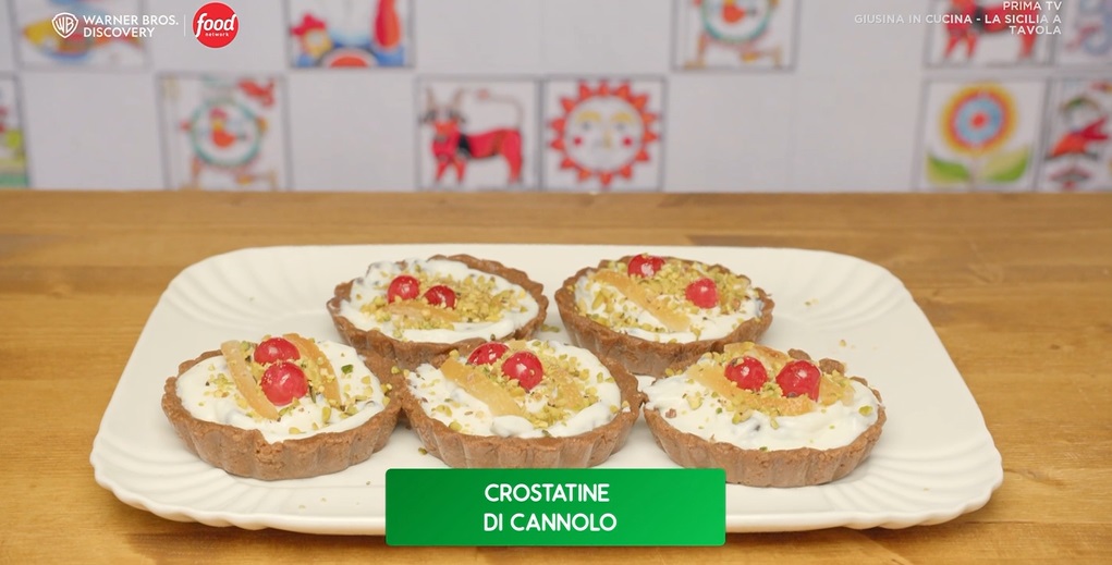 Nelle nuove puntate della serie di Food Network Giusina in cucina, dedicata alla cucina siciliana preparata in maniera semplice, ‘casalinga‘, in onda sabato 28 gennaio, alle 15:45, sul canale 33, Giusina Battaglia, giornalista ed appassionata di cucina, ha preparato un menu squisitamente siciliano, rivelando la ‘sua‘ ricetta delle crostatine di cannolo. Trovate le ricette di Giusina nel suo libro, da poco in libreria, e sul suo sito, giusinaincucina.com. Di seguito gli ingredienti necessari ed il procedimento.