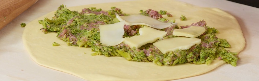 Dividiamo l’impasto in 4-5 parti uguali. Stendiamo ciascuna con il mattarello, ad uno spessore di pochi mm, in modo da ottenere dei dischi. Su ogni disco, mettiamo abbondante ripieno, della tuma o provola a fettine, quindi ripieghiamo l’impasto sul ripieno, a mezzaluna, e sigilliamo bene i bordi, eliminando l’eccesso con una rotella. Disponiamo sulla teglia, spennelliamo con l’olio e bucherelliamo con una forchetta, quindi cuociamo in forno caldo e statico a 220° per 20 minuti circa.