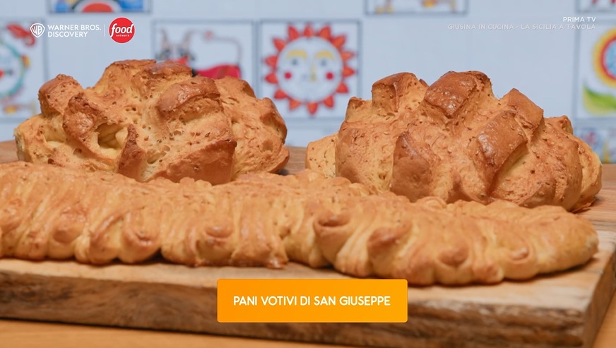 Nelle nuove puntate della serie di Food Network Giusina in cucina, dedicata alla cucina siciliana preparata in maniera semplice, ‘casalinga‘, in onda sabato 16 marzo, alle 15:45, sul canale 33, Giusina Battaglia, giornalista ed appassionata di cucina, ha preparato un menu squisitamente siciliano, rivelando la ‘sua‘ ricetta dei pani votivi di San Giuseppe. Trovate le ricette di Giusina nel suo nuovo libro, da poco in libreria, e sul suo sito, giusinaincucina.com. Di seguito gli ingredienti necessari ed il procedimento.