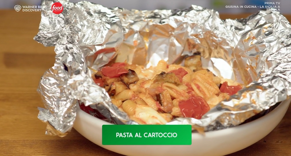 Nelle nuove puntate della serie di Food Network Giusina in cucina, dedicata alla cucina siciliana preparata in maniera semplice, ‘casalinga‘, in onda sabato 4 marzo, alle 15:45, sul canale 33, Giusina Battaglia, giornalista ed appassionata di cucina, ha preparato un menu squisitamente siciliano, rivelando la ‘sua‘ ricetta della pasta al cartoccio. Trovate le ricette di Giusina nel suo libro, da poco in libreria, e sul suo sito, giusinaincucina.com. Di seguito gli ingredienti necessari ed il procedimento.