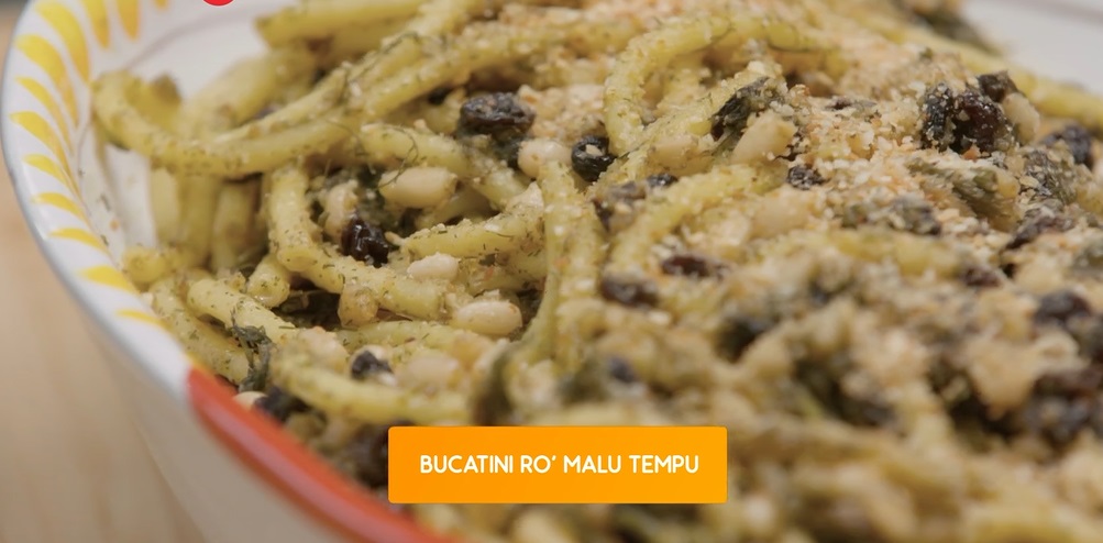 - 300 g bucatini, 2 bustine di zafferano, 1 mazzetto di finocchietto, 1 cucchiaio pasta d’acciughe, mezzo bicchiere vino bianco, 2 spicchi d’aglio, 50 g filetti di acciughe, 50 g pinoli, 40 g uvetta passolina, muddica atturrata, pepe
