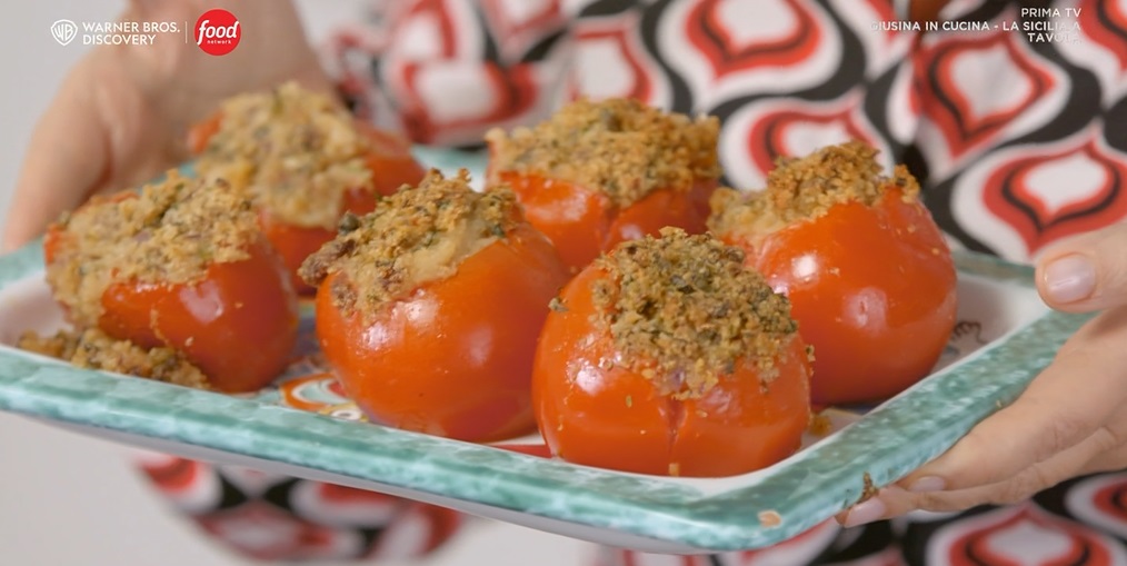 - 6 pomodori, caciocavallo, 30 g acciughe, mezza cipolla, prezzemolo, 1 spicchio d’aglio, 150 g pangrattato tostato, 20 g capperi, origano, sale, olio evo